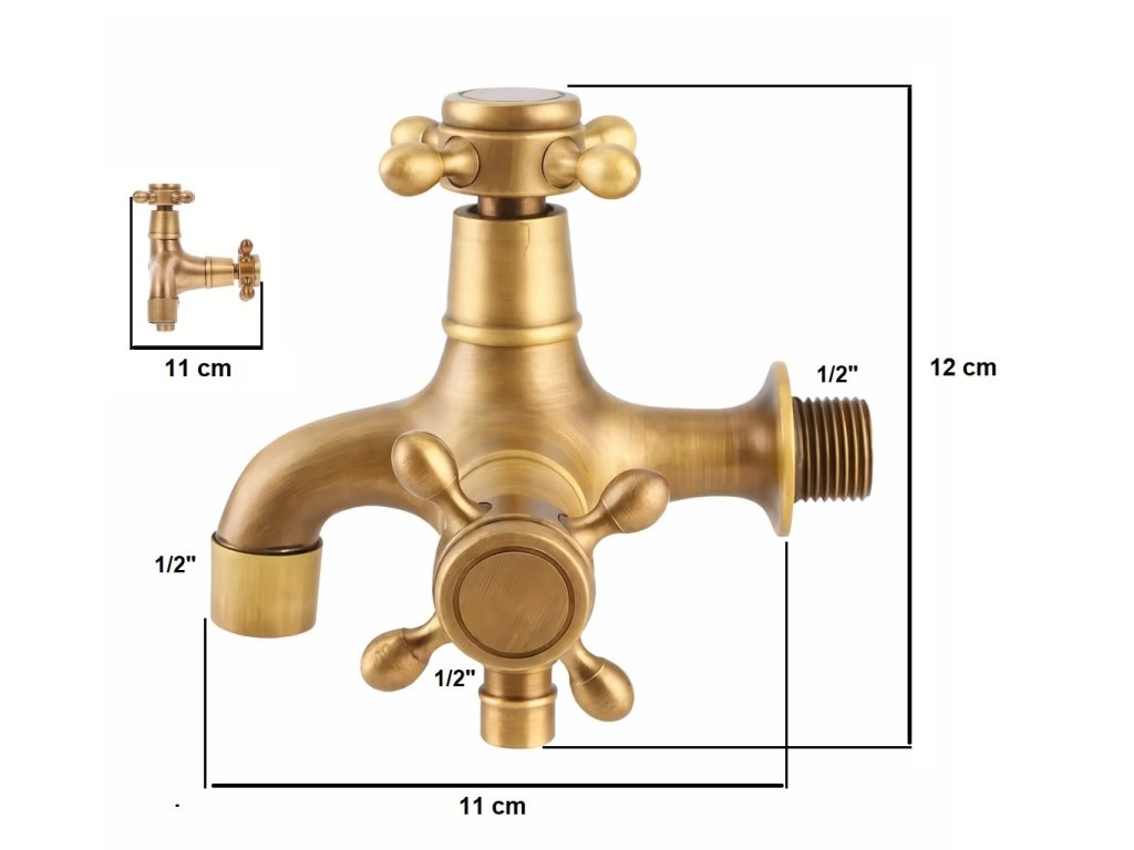Zahradní dvojitý ventil Retro - výtokový ventil se dvěma vývody 1/2"x1/2"x1/2" - mosaz