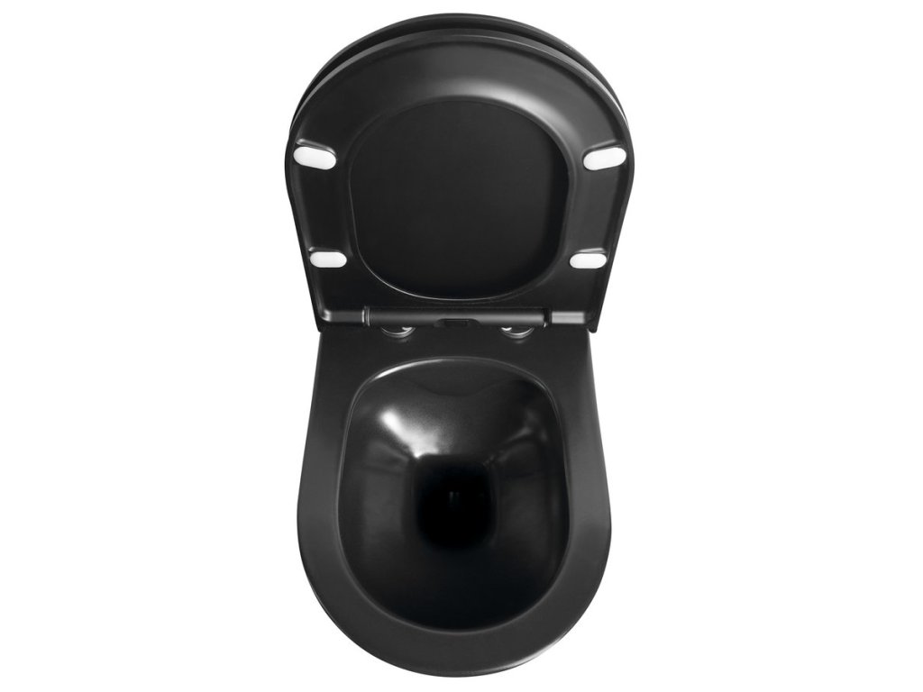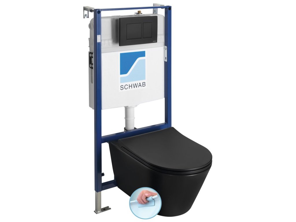 AVVA závěsné WC Rimless s podomítkovou nádržkou a tlačítkem Schwab, černá mat