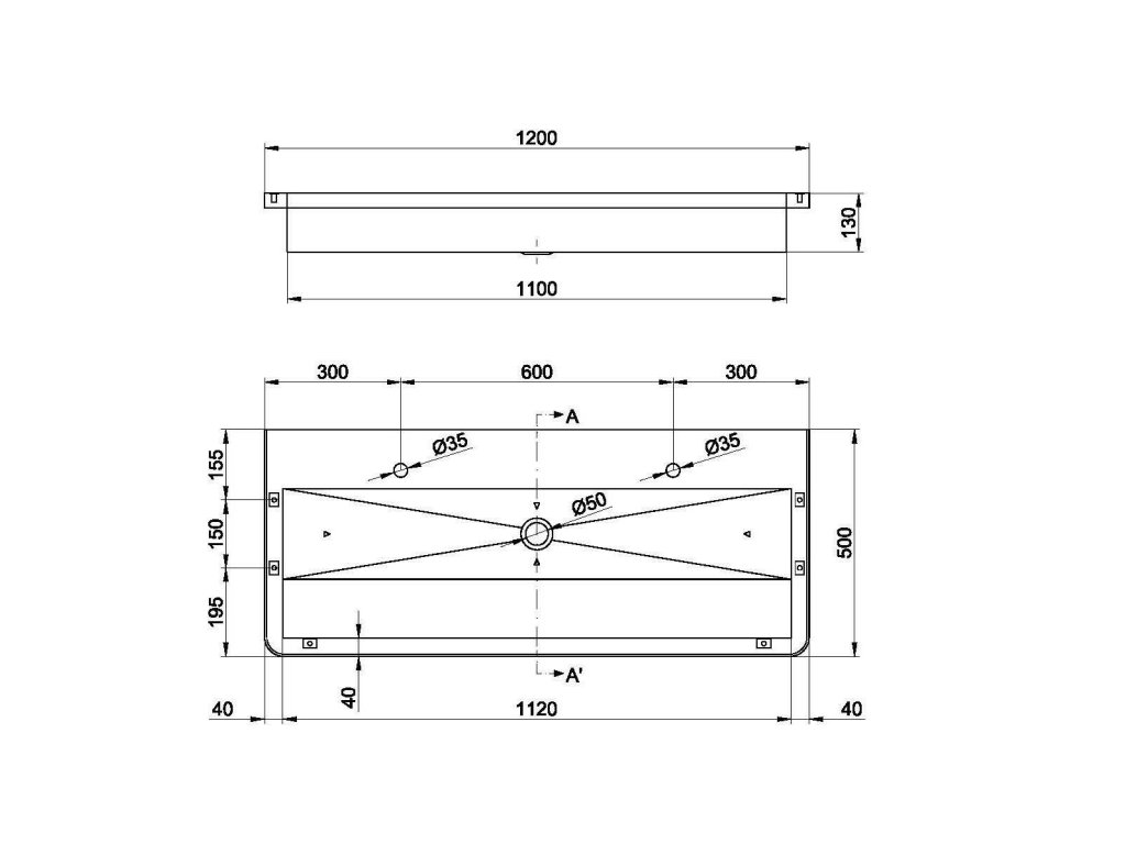 Závěsný umývací žlab 1200x130x500 mm, nerez mat