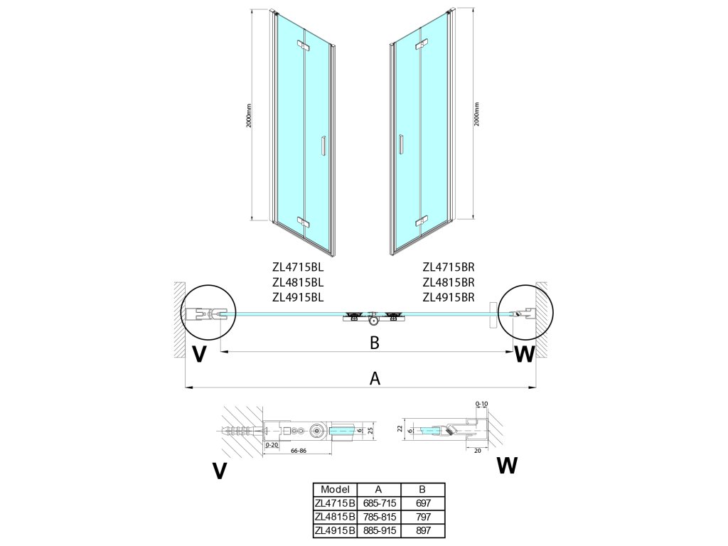 - Skládací dveře 700 až 900 mm v provedení levá a pravá lze instalovat do niky nebo v kombinaci L/R vytvořit čtvercovou nebo obdélníkovou zástěnu s rohovým vstupem