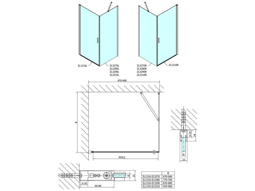 - Skládací dveře 700 až 900 mm v provedení levá a pravá lze instalovat do niky nebo v kombinaci L/R vytvořit čtvercovou nebo obdélníkovou zástěnu s rohovým vstupem