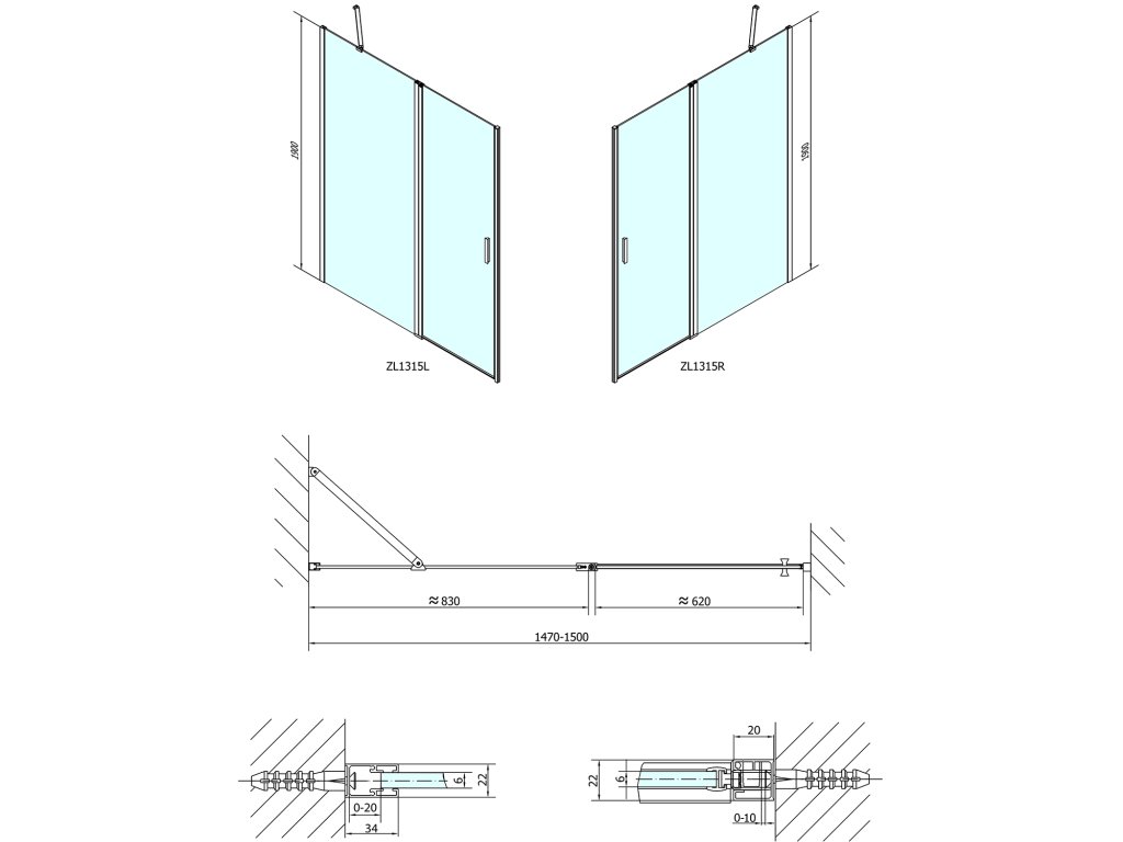 - Dveře 1600 a 1800 mm mají 2 pevné části a 2 otočné části, vhodné pouze pro instalaci do niky, nelze je kombinovat s boční stěnou